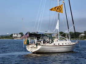After spending a rest day in Watch Hill, RI, we headed out for a scheduled helicopter photo shoot! Yes, one of our Island Packet Fleet members, Jim is a professional helicopter pilot and he also owns his own heli. So with the coordination of another fleet member, Greg and his professional photographer friend (Wayne Dion http://Dion.com ) we pulled off the first Island Packet Yacht Owners' Heli shoot! The am weather was not looking good, but after staging up 8 IPs at Point Judith, we waited the scheduled time for the heli and the weather improved!Sure enough, with the heli fueled and on the pad and the pilot and photographer ready, the weather cleared and the winds came up to 12 knots! It was unreal, after a week or more of rain, fog and no wind, that this cleared up and the heli could fly. All the yachts were staged, and the photographer ready, so the VHF call came....."Anchors UP, we are heading out"..... and 8 Island Packerts set sail out the Point Judith harbor for a rendezvous with Greg who was sailing south out of Wickford and nearing the Point Judtih Lighthouse.